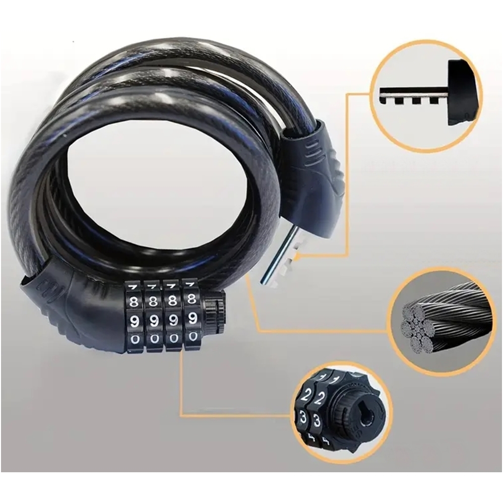 Számkódos spirálzár állítható kóddal. Műanyag borítással, amely alatt 6 mm-es acélsodrony található. A borítás megvédi a kerékpár vázát a sérülésektől. A vastag és strapabíró belső acél kábelsodrony maximális védelmet biztosít. 4 számos kombinációs kód. A termék hossza 60 cm.